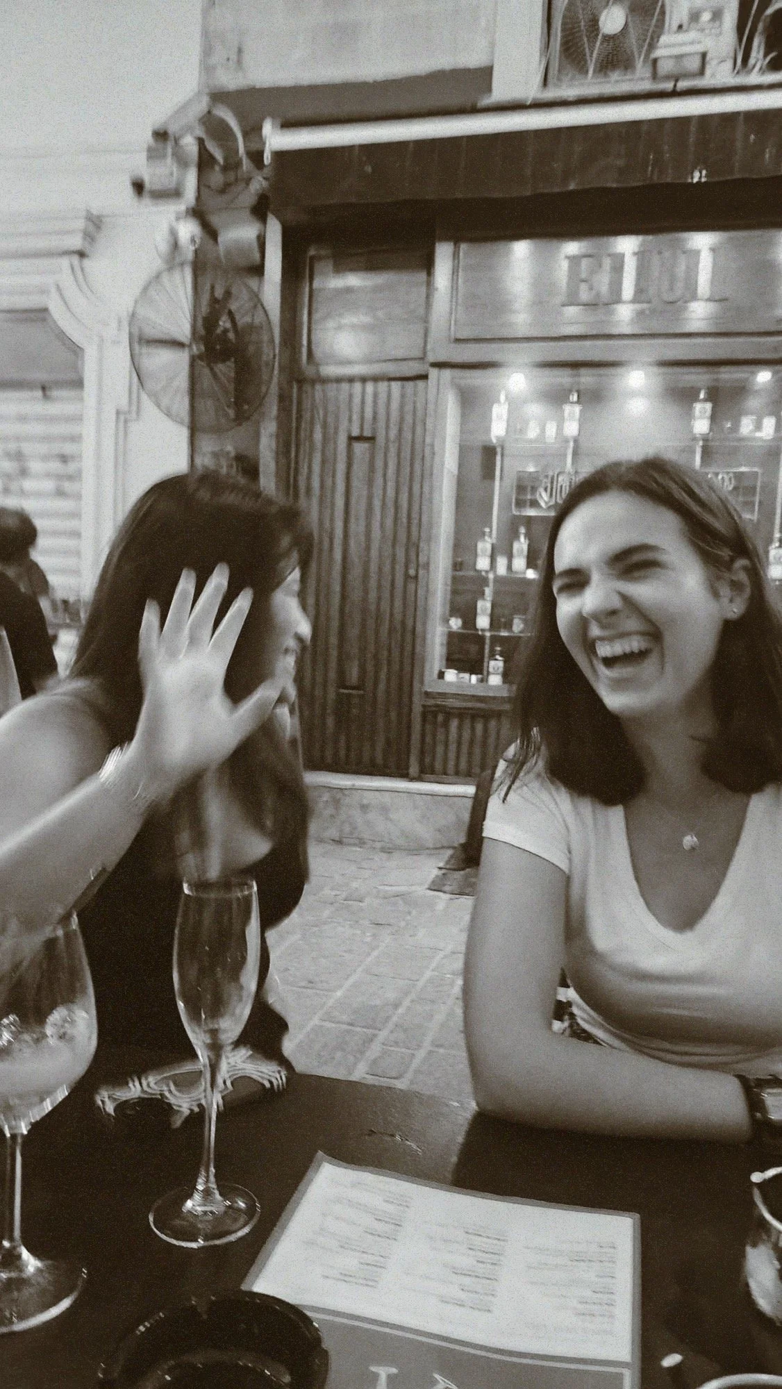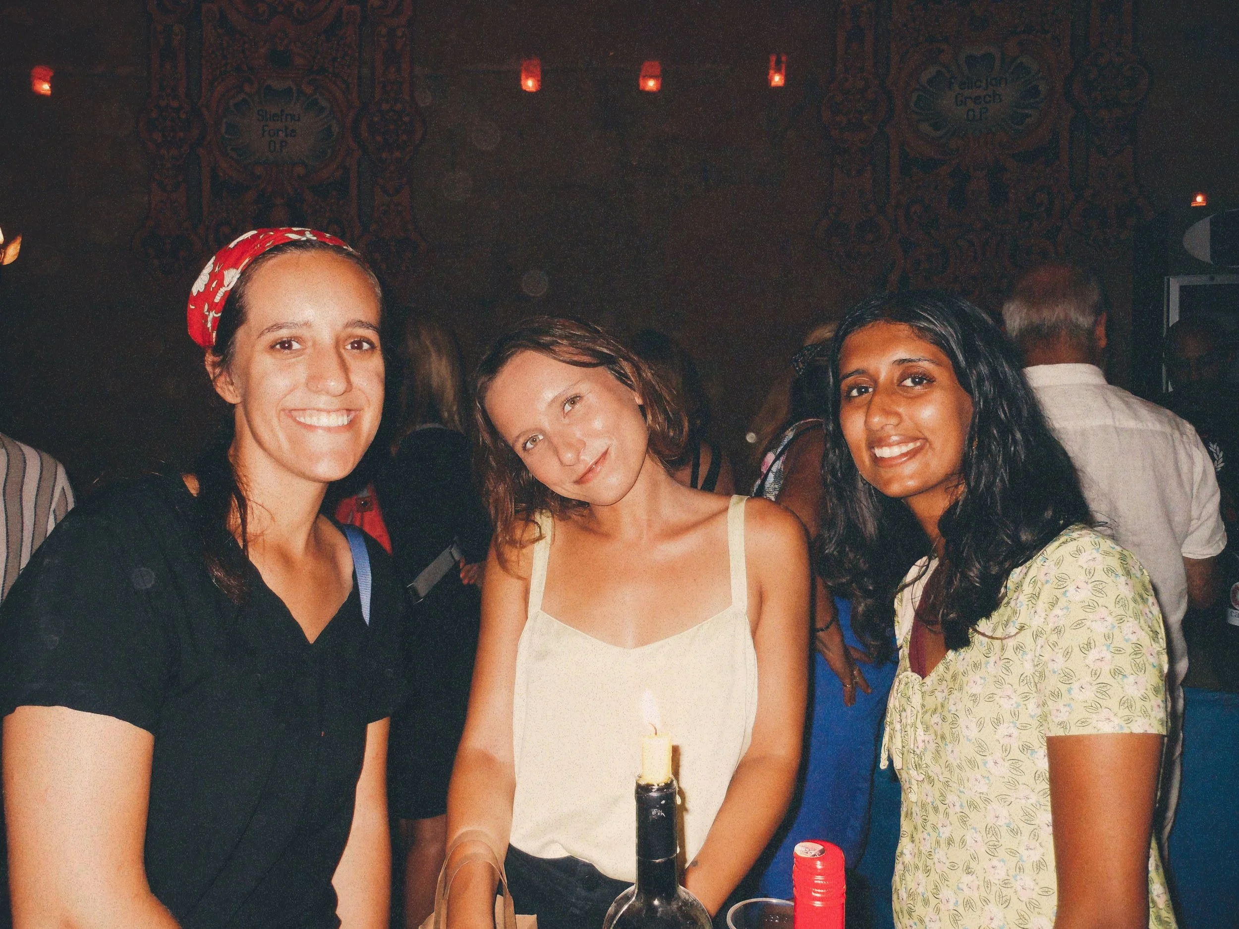 Aleah, Alyssa, and Shalaka at a wine bar in Valletta on Notte Bianca.