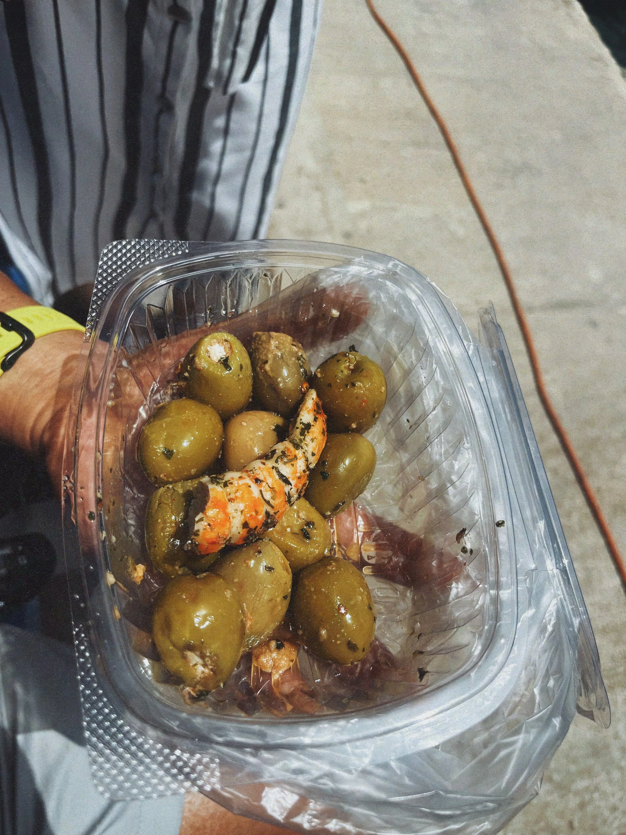 Stuffed olives and shrimp from a vendor at the Sunday open market in Marsaxlokk, Malta. Marsa means port and xlokk means south-east.