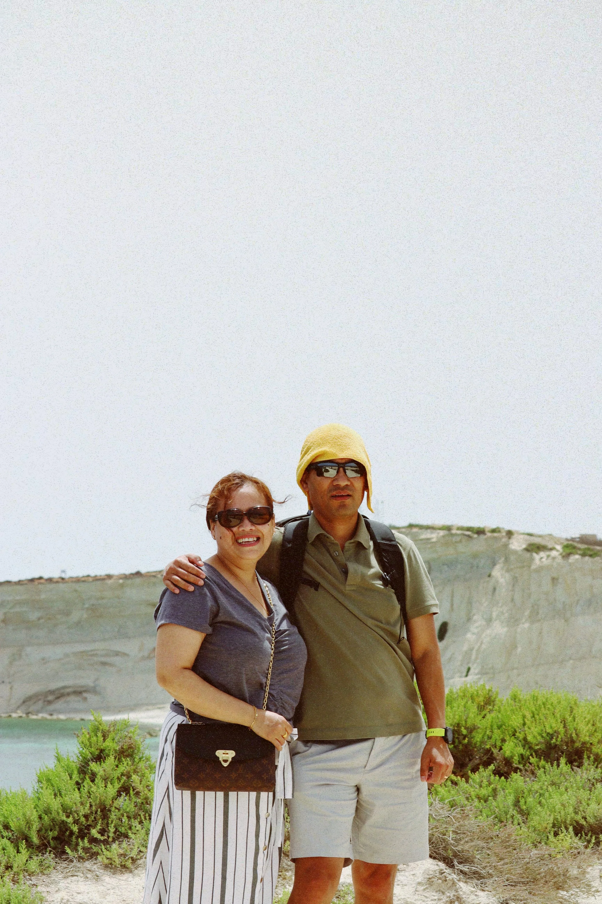 My mom and dad on Muxar Path, Malta. It was too hot for my dad, hence the towel-hat contraption.